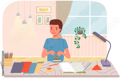 Young male character doing DIY. Kid spends time creatively in apartment. Creative pastime at home. Boy makes paper crafts, glues and cuts with scissors. Guy collects toy pyramid, handmade hobby