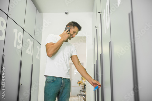 Young male doctor in a changing room talking on the phone and looking involved