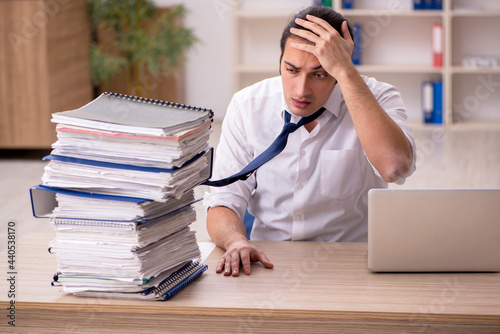 Young male employee and a lot of work in the office