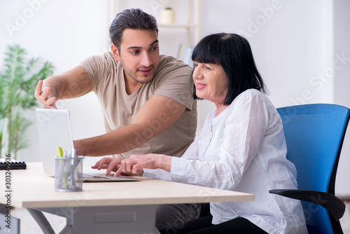 Young male employee explaining to old female colleague how to us