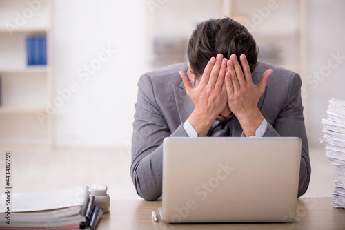 Young male employee unhappy with excessive work in the office