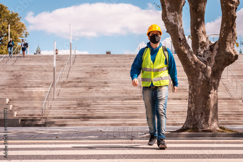young male engineer walking across the street by the crosswalk.