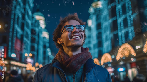 young male in warm clothes and eyeglasses smiling while looking up at lanterns and admiring London city street at night Generative ai