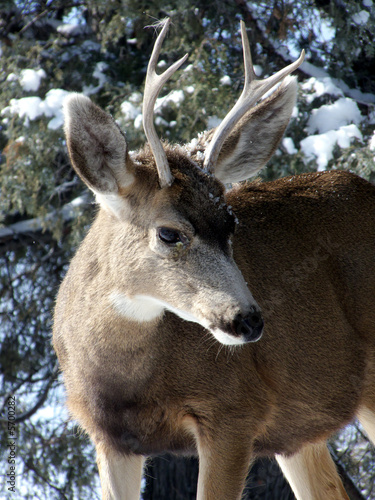 buck, cervid, male, mule, antler, horn, furry, snow, winter storm, pine, tree, mountain, forest