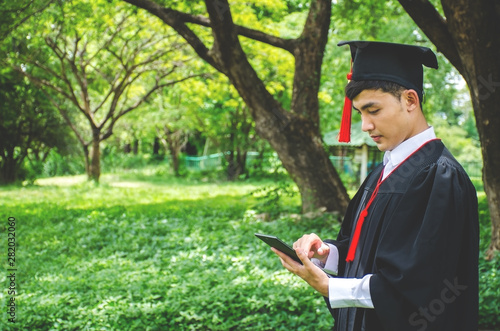 Young male students dressed in black graduation gown. Nature as a background. Boy cheerfully smiling, looking at mobile phone .