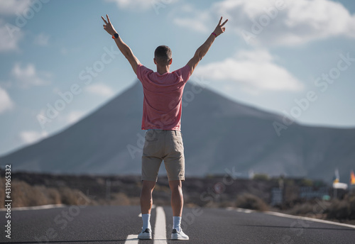 young, male, holiday maker, gesticulate, peace, volcanic, rock, lanzarote, vacation, spain, copy space, 1, people, travel, adult, man, journey, outdoors, day, tour tourism, exploration, standing, atlantic, island, sunlight, landscape, raising, arm, casual attire, signs, volcano, mountain, caucasian, road, expressway, highway, nature, cloud, sky, stone
