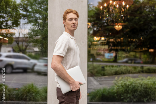 wireless, device, laptop, business, fashion, digital, man, young adult, active, workspace, building, movement, urban, outdoors, holding, contraption, motion, casual attire, red hair, technology, city, walking, wall, life, ginger, architecture, confident, natural light, male, street, modern