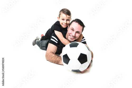 Young man and a boy with a soccer ball isolated on white background