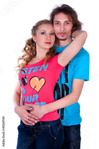 Young man and woman embracing dressed in colorful T-shirts