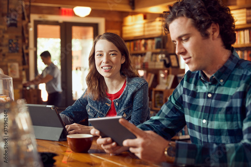 Young man and woman sitting at counter in cafe bookstore using digital tablets , woman looking at camera smiling
