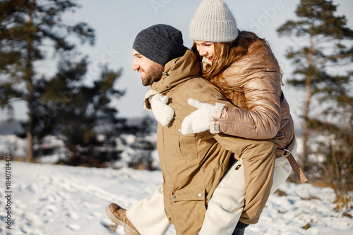Young man and woman spending time together at winter day