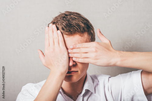 adult, attractive, background, black, blind, blindfold, businessman, caucasian, close, communication, concept, corporate, cover, cute, emotion, executive, expression, eye, face, facial, fear, hand, photogenic, head, hide, human, isolated, male, man, model, modern, necktie, 1, people, person, portrait, problem, red, secrecy, secret, shirt, shy, stress, studio, surprise, white, men at work, young