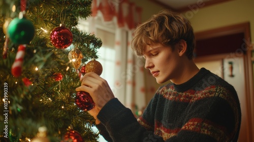 christmas, tree, decoration, young, man, ornament, festive, holiday, cosy, living, room, celebration, tradition, winter, joy, family, indoor, light, red, green, gold, cheerful, spirit, home, preparation, gathering, gift, clothing, sweater, atmosphere, warmth, creativity, season, seasonal, nostalgia, happiness, community, togetherness, childhood