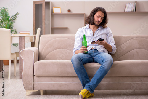 Young man drinking alcohol at home