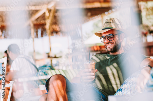 adult, people, lifestyle, photogenic, vacation, travel, happy, leisure, bar, beach, bearded, joy, enjoying, 1, summer, cheerful, casual attire, hipster, hat, ice, hot drink, male, man, young, beautiful, beauty, fun, drink, outside, lounge, caucasian, white, holiday, sea, looking, tour tourism, tropical, cool, sitting, eatery, holiday maker, cup, alone, mediterranean, relaxing, refreshing, greece