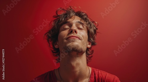 young, man, expressing, relief, standing, solid, studio, background, relaxed, expression, deep, breath, clear, emotion, content, look, minimalistic, environment, personal, space, comforting, mood, setting