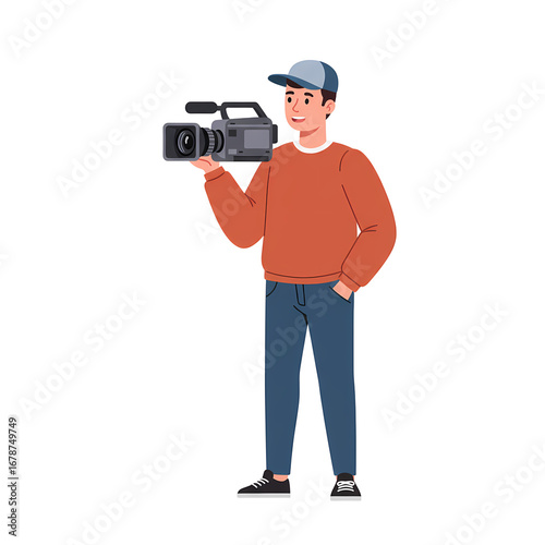 man, young, casual attire, confident, smiling, holding, camcorder, studio, creative, media, production, content, filming, technology, professional, equipment, camera, digital, lifestyle, entertainment, broadcast, video, film, studio shot, indoor, modern, focused, casual clothes, studio photography