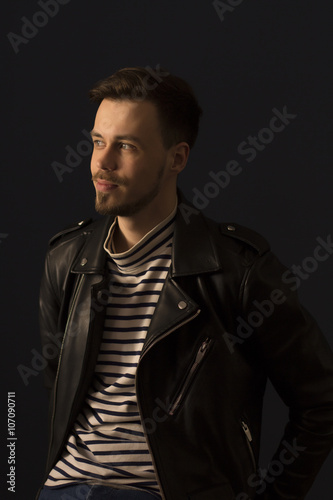 Young man in a leather jacket with shadows