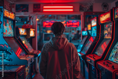 young men, standing, gaming, room, retro, arcade, nostalgia, vintage, entertainment, fun, leisure, recreation, gamer, console, gameplay, 80s, 90s, old school