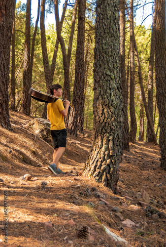 Young man in a yellow T-shirt walking on his back with a guitar in the pine forest