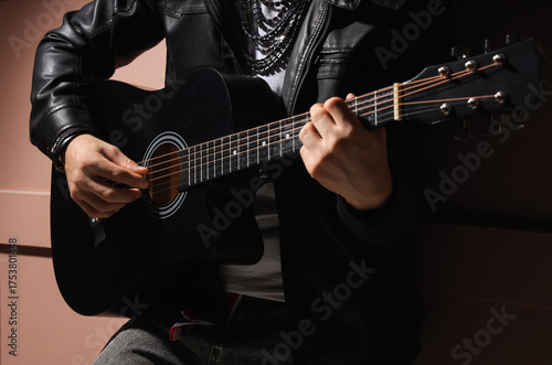 Young man in leather jacket playing guitar on brown background