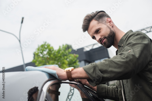 outdoors, caucasian, shine, transport, vehicle, brunette, man, car, blur, shirt, wax, clean, auto, polish, casual attire, rag, wipe, bearded, waxing, one person, young adult
