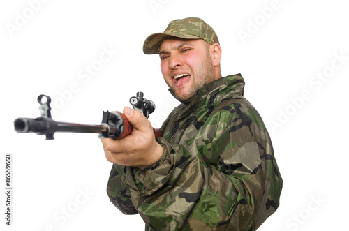 Young man in soldier uniform holding gun isolated on white