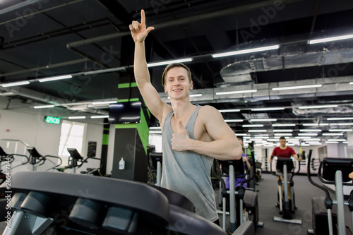 Young man in sportswear running on treadmill at gym and showing thumbs up