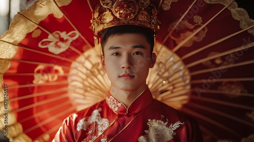 man, asian, wedding, red, traditional, costume, clothing, attire, groom, ceremony, culture, heritage, portrait, face, young, adult, male, photogenic, elegant, style, fashion, model, pose, serious, expression, look, umbrella, ornate, gold, crown, headdress, festive, celebration, holiday, happiness, joy, auspicious, prosperity, luck, beauty, elegance, apparel, garment