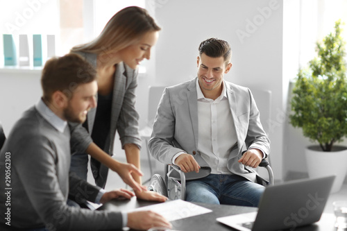 Young man in wheelchair with colleagues at workplace