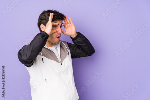Young man isolated on purple background keeping eyes opened to find a success opportunity.
