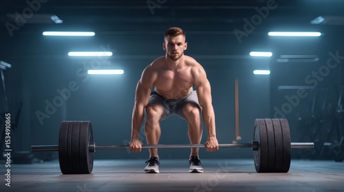 Young Man Lifting Heavy Barbell in Modern Gym with Dramatic Lighting