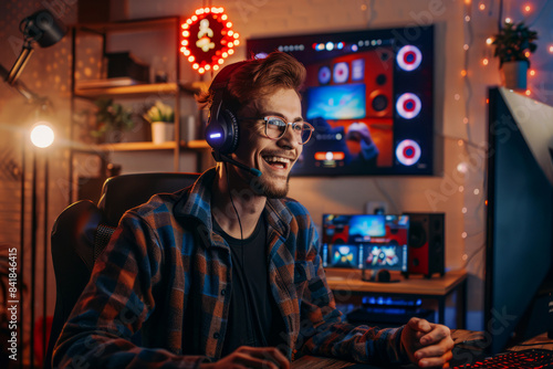 young, man, live, streaming, video, game, session, cosy, home, studio, night, gamer, earphones, computer, screen, monitor, technology, fun, entertainment, online, broadcasting, player, digital, cyberspace, equipment, interactive, hobby, light, console, playing, smiling, communication, indoor, passion, focused, excitement, electronic, device, illuminated, festive, relaxed, joyful, atmosphere, setup