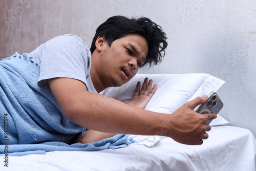 Young man looking at time of alarm clock on smartphone while lying on bed in bedroom with shocked expression. Late for work.