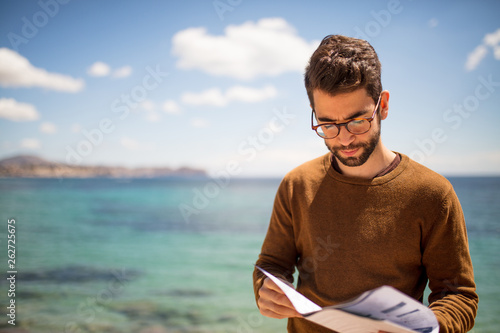 adult, adventure, attractive, beard, beauty, casual attire, caucasian, city, confidence, destination, explorer, expression, fashion, friendly, healthy, hispanic, holding, holiday, human, journey, leisure, lifestyle, looking, male, man, map, model, modern, nature, outdoors, people, person, portrait, reading, relax, shirt, smile, spring, standing, summer, sunny, tour tourism, holiday maker, travel, trip, urban, vacation, vacation, young