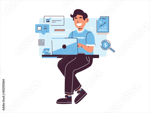 man, laptop, finance, budgeting, productivity, tax, datum, management, cheerful, young, adult, digital, technology, accounting, desk, sitting, planning, calculating, happy, focused, illustration, vector, graph, statistic, money, savings, financial, analysis, report, investment, blue, casual attire, modern, office, work, home, indoor, user, interface, display, screen