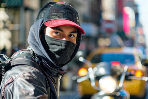 young, man, mask, moped, street, scooter, food, delivery, migrant, latino, new york city, city, urban