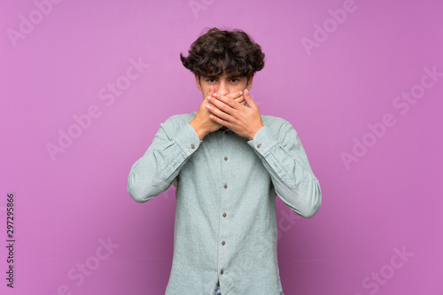 man, man, people, person, male, guy, photogenic, slim, youth, young, hispanic, caucasian, curly, background, wall, isolated, purple, cover, close, covering, expression, gesture, hand, mouth, secret, worried, surprise, shy, silence, shock, mistake, emotion, scared