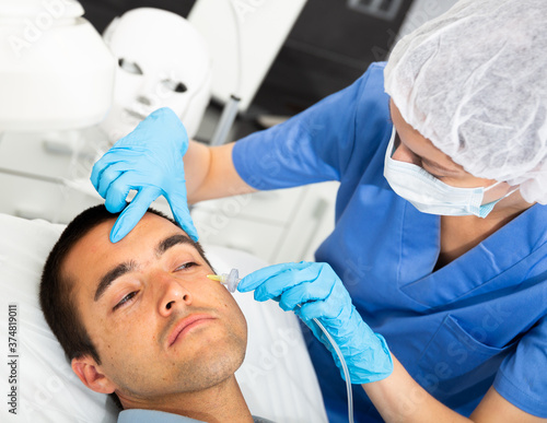 Young man patient receiving anti-aging injections carboxytherapy procedure in beautician office of aesthetic clinic