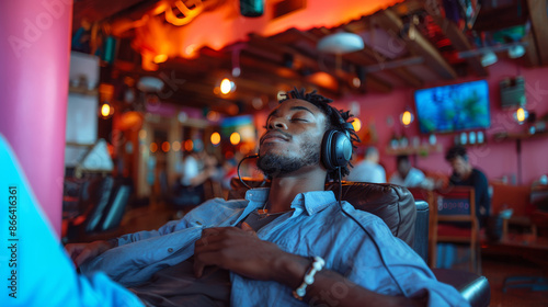 Young Man Relaxing with Headphones in a Vibrant Cafe Setting