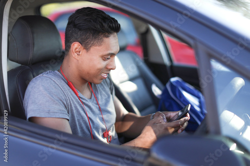 Young man sitting in car looking at smartphone