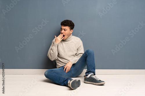 Young man sitting on the floor yawning and covering wide open mouth with hand