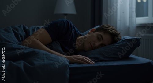 man, sleep, night, bed, bedchamber, dream, rest, dark, cosy, relaxation, young, male, peaceful, lifestyle, window, room, sleepy, head, hand, blanket, pillow, comfortable, domestic, apartment, alone, calm, tranquil, home, dorm