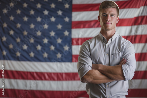 Young man smiling in front of an American flag.