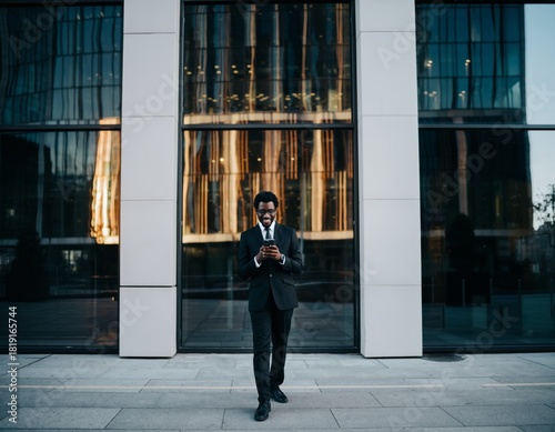 Young Man Standing Urban Skyscraper Looking Smartphone Screen