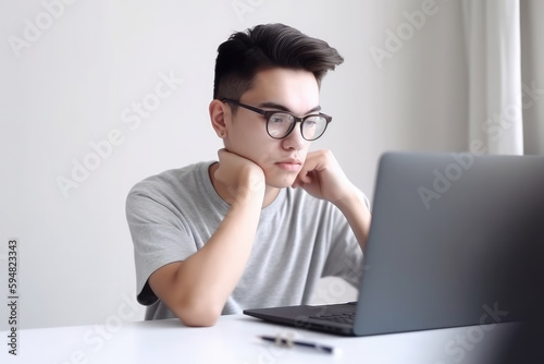 Young man student using laptop computer at home studying online. Distance study, work from home, e-learning or business meeting online. High quality generative ai