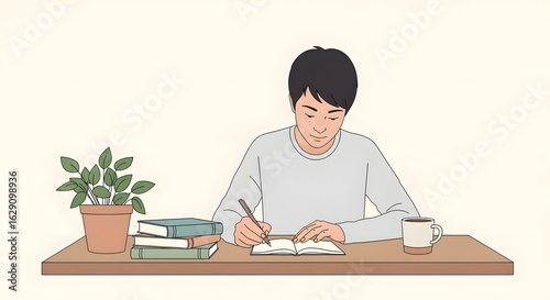 man, young, focused, writing, notebook, desk, book, plant, coffee mug, bright, minimalist, interior, home, indoor, relaxed, calm, concentration, learning, studying, workspace, office, comfortable, modern, clean, simple, serene, neutral, natural light, still life, lifestyle, education, creative, relaxing, working, reading, human, portrait, artistic, minimal, decorative, home office