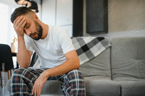 Young man suffering from strong headache or migraine, morning after hangover concept