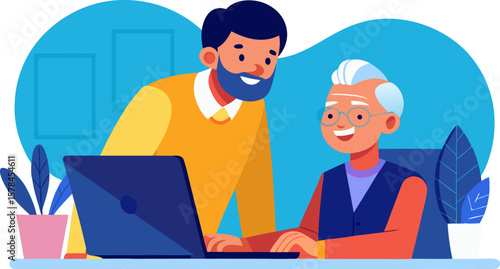 senior, elderly, grandfather, man, young, boy, laptop, computer, learning, teaching, digital, technology, cyberspace, support, help, family, connection, communication, teamwork, training, education, mentor, guide, care, friendly, vector, illustration, office, home, workspace, modern, smiling, screen, keyboard, cooperation, online, people, happy, coaching, youth, bonding, love, cognition, advice, aged, user
