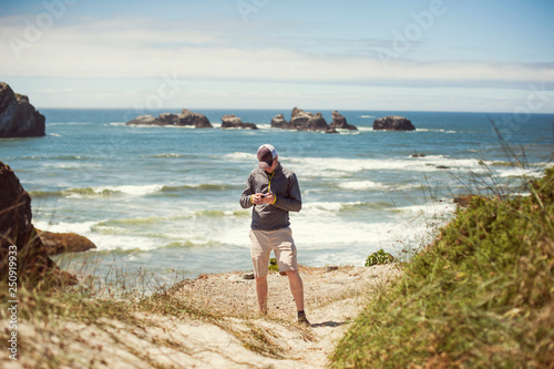 no people, horizontal, outdoors, day, front view, full-length, one person, sea, sand, beach, cap, rock, grass, short, standing, casual clothes, text messaging, communication, access, connection, wireless technology, sky, cloud, looking down, california, us, clothing, cap, text message, text message, communicate, concept, connection, wi-fi, weather, ca, us, north america, central america, america, american, nobody, outside, afternoon, daylight, daytime, 20s, 20s, youngster, man, male, young adult, 20 years, young men, single person, ocean, ocean, salt water, salt water, sea, sand, beach, shore, shore